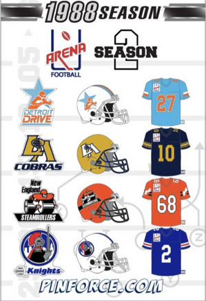 Our FIFTH in a series of pins from the old Arena Football League. We start with the original league, 1988 second season!! Next up is the DETROIT DRIVE JERSEY!! Pins are 1.5 inches in height. Each pin comes with a collectors card for that season depicting the assortment that will be available. There is also a series buy for each team available for a discounted price.