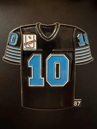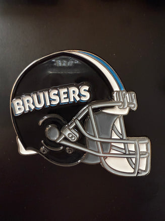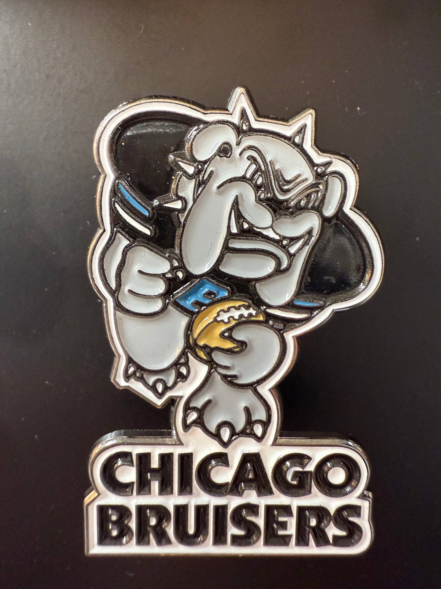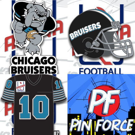 Our Third in a series of pins from the old Arena Football League. We continue with the Chicago Bruisers Logo, Helmet, and Jersey in a group purchase for a discounted price. Each pin comes with a collectors card for that season depicting the assortment that will be available, each team will release separate from the other teams.. You can also purchase any of the item in this collection individually when then release!!