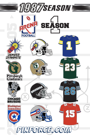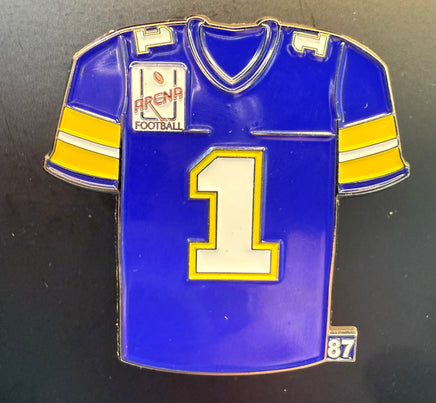 Our FIRST in a series of pins from the old Arena Football League. We start with the original Champion the Denver Dynamite Logo, Helmet, and Jersey and the original AFL league logo in a group purchase for a discounted price. Each pin comes with a collectors card for that season depicting the assortment that will be available, each team will release separate from the other teams.. You can also purchase any of the item in this collection individually when then release!!