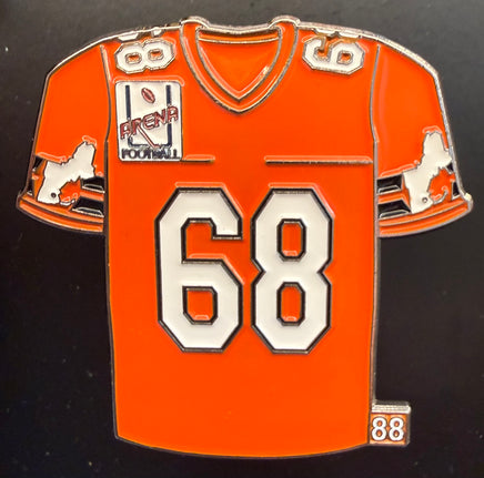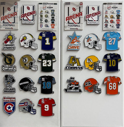 Our SEVENTH in a series of pins from the old Arena Football League. We start with the original league, 1988 second season!! Next up is the NEW ENGLAND STEAMROLLER JERSEY!! Pins are 1.5 inches in height. Each pin comes with a collectors card for that season depicting the assortment that will be available. There is also a series buy for each team available for a discounted price.