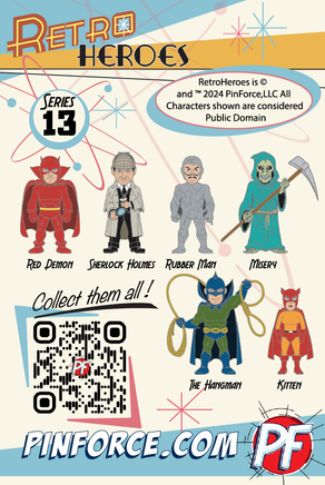 The 2nd release of our RetroHeroes™ Series 13 lineup!!! It's elementary!!!!! Sherlock Holmes is on the case!!!!! Want all the RetroHeroes™?? Go to the Series 13 Group page and get them at a GREAT price all at once, or purchase them individually!! Each pin comes on a Series 13 Collectors card.