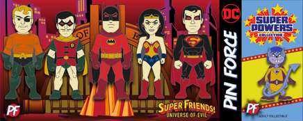 NOW AVAILABLE at PinForce!! The Universe of Evil 5 pack featuring the Super Friends from an another Dimension, a dimension of EVIL!! But wait, there's more!!! ALSO included is EVIL GLEEK! This will be the ONLY way to get him! The set comes on a SPECIAL Universe of Evil Backer Card!!