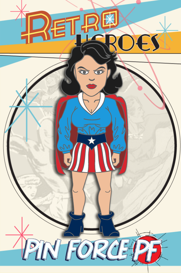 The 3rd release of our RetroHeroes™ Series 14 lineup!!! Her name is Pat and she's a Patriot!!!!! Pat Patriot is here!!!!! Want all the RetroHeroes™?? Go to the Series 14 Group page and get them at a GREAT price all at once, or purchase them individually!! Each pin comes on a Series 14 Collectors card.