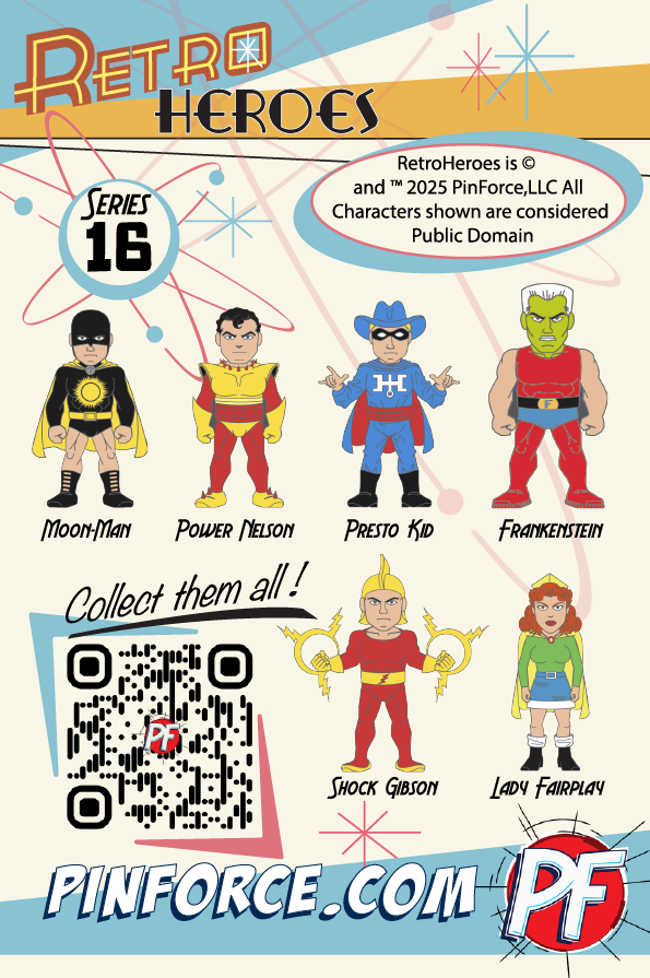 Series 16 includes MOON-MAN and POWER NELSON on DECEMBER 8th, PRESTO KID and FRANKENSTEIN on DECEMBER 18th, and SHOCK GIBSON and LADY FAIRPLAY DECEMBER 28th OR you can buy them ALL at once, right now, for a discounted price of $49.95!! You get 1 character free!!!! Start your collection today!! Your characters come on the Series 16 Collectors backercard!!